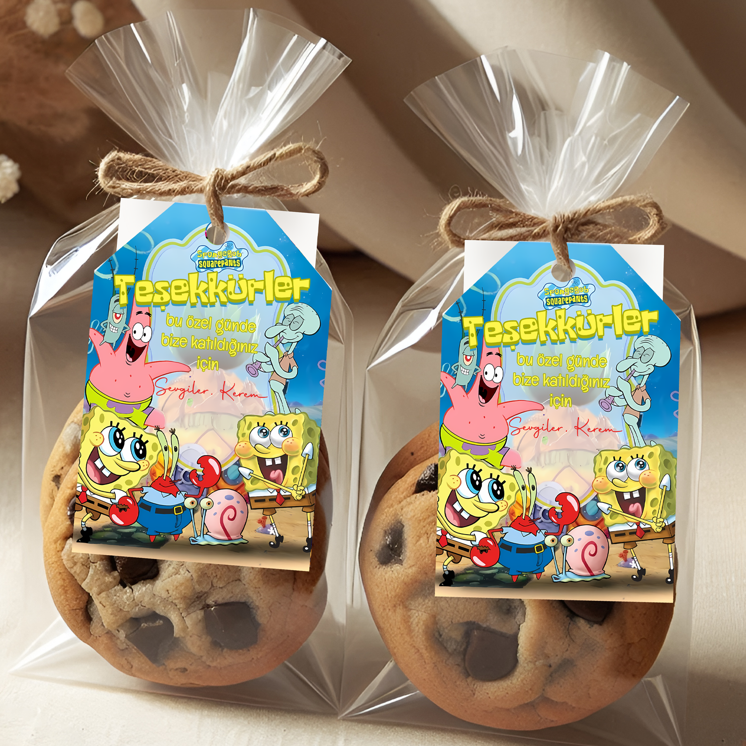 Sünger Bob temalı doğum günü partilerine neşeli, renkli ve eğlence dolu bir dokunuş katmak isteyenler için özel olarak tasarlanan kişiye özel teşekkür kartlarımız, misafirlerinize unutulmaz bir hatıra sunar.